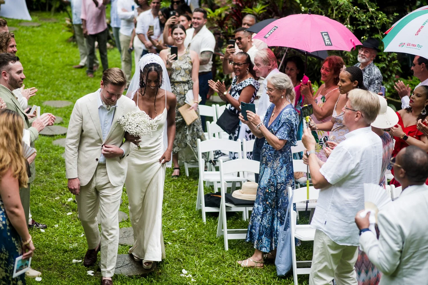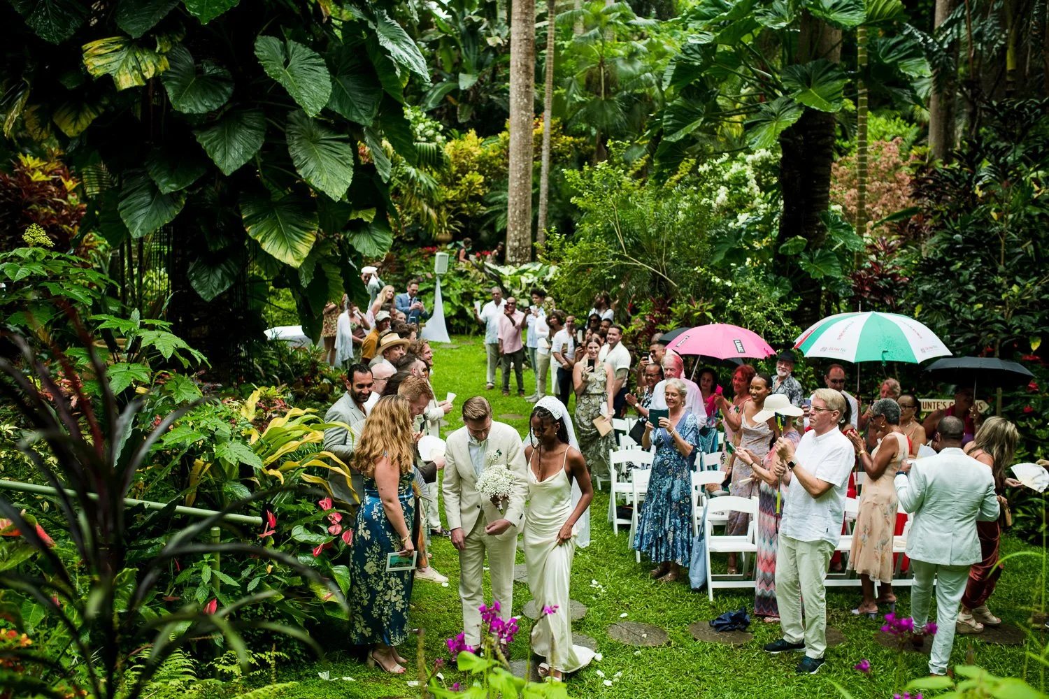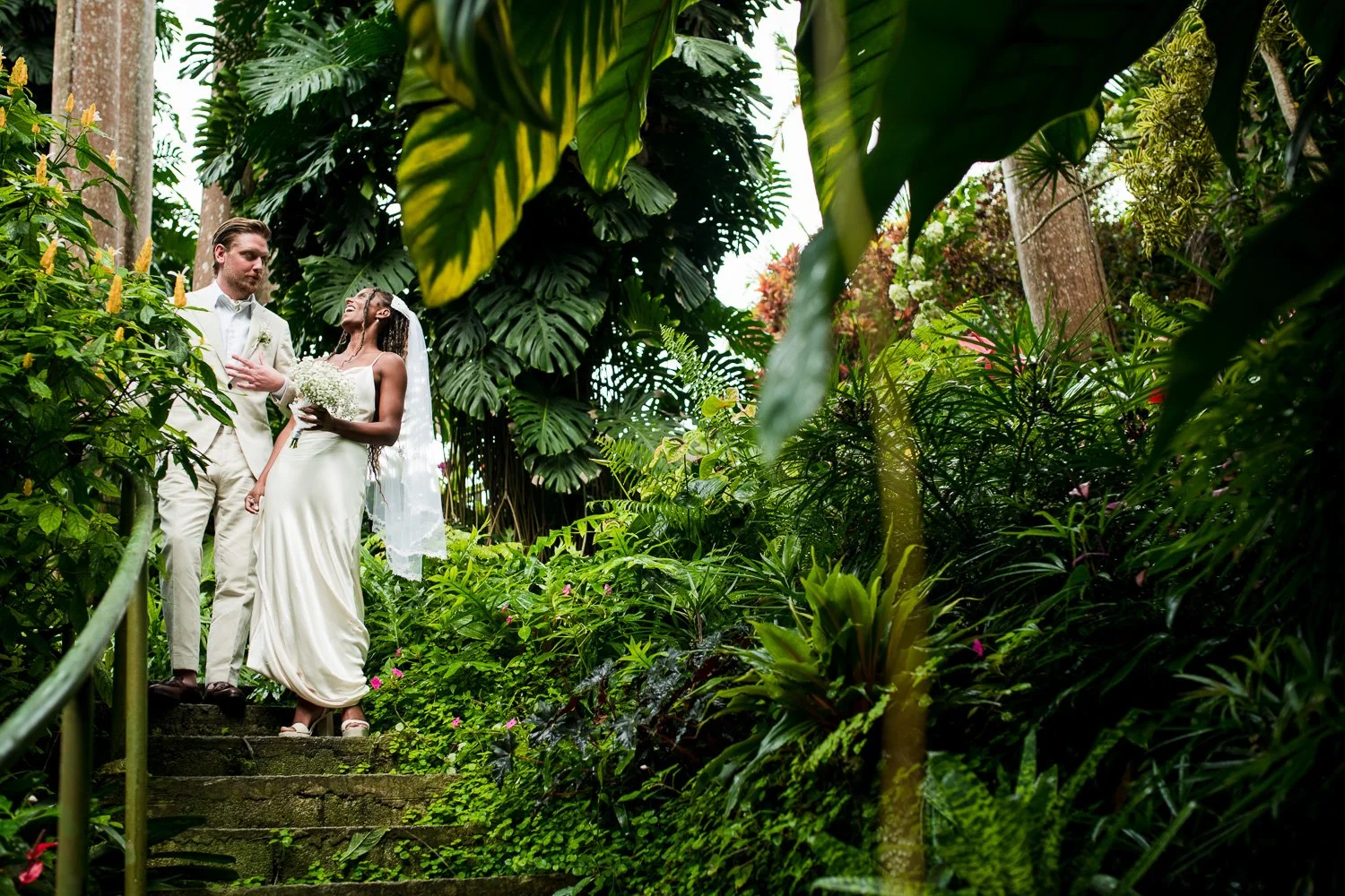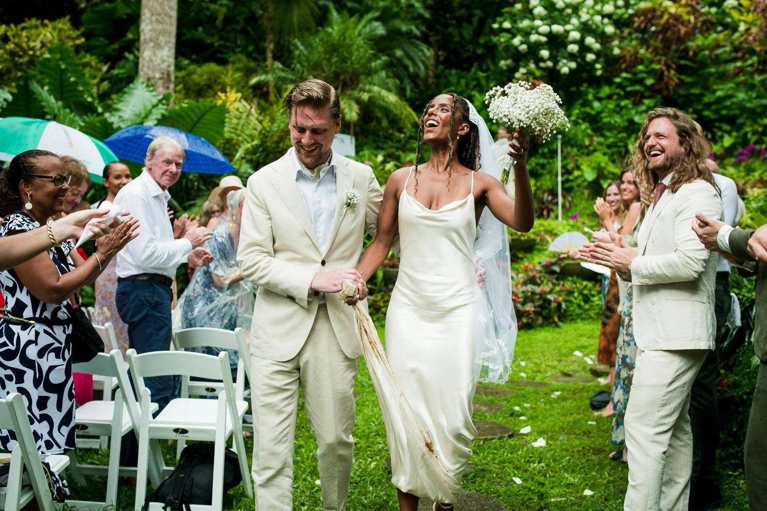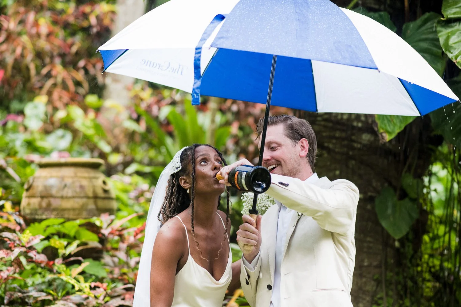 But never once was there a look of dismay on Jennifer or Joel’s face. From the time they arrived at the stunning Hunte’s Garden’s for their wedding, they had huge smiles on their faces. But more, they just laughed through it all. Her white dress turned brown on the bottom, the aisle was water logged, they drank champagne under an umbrella.