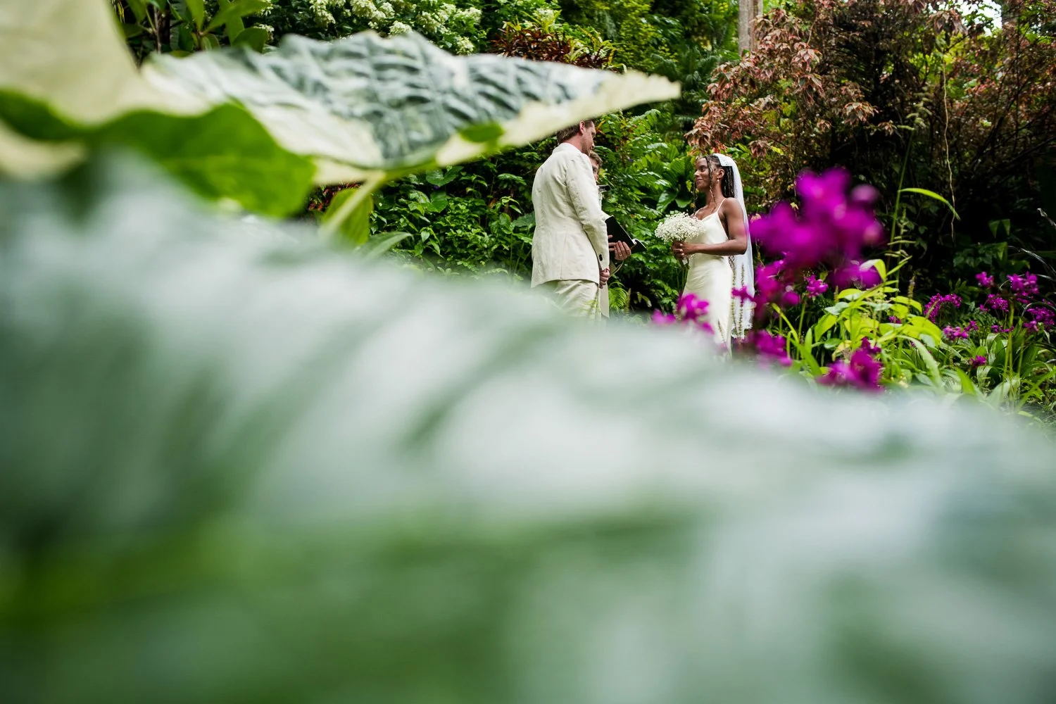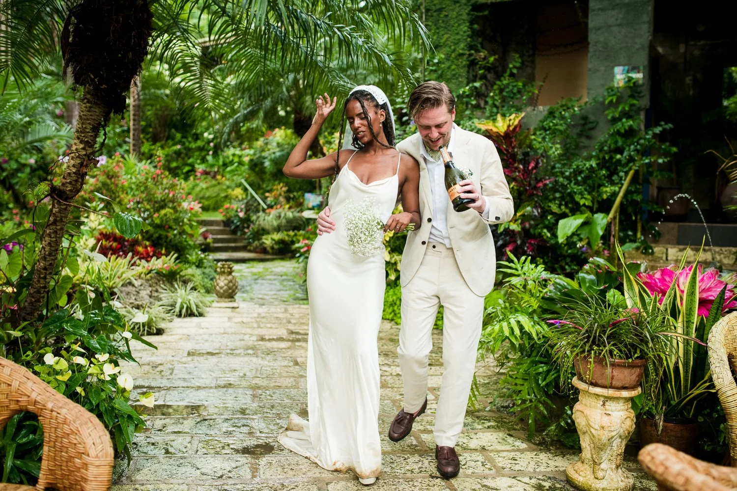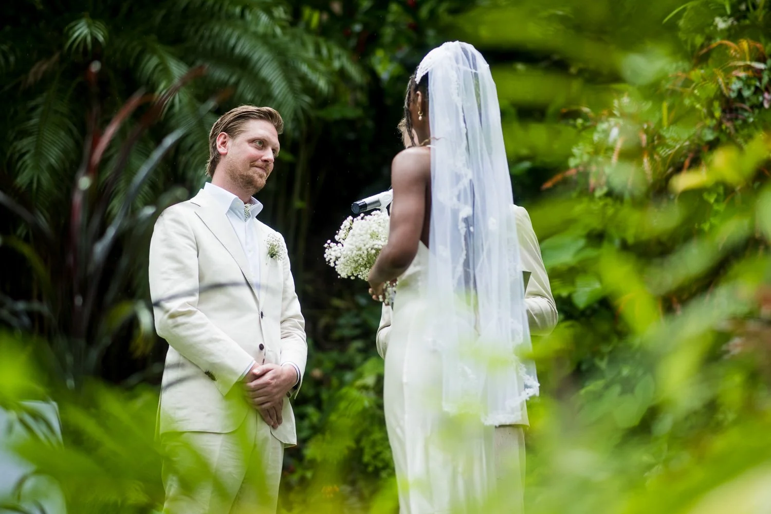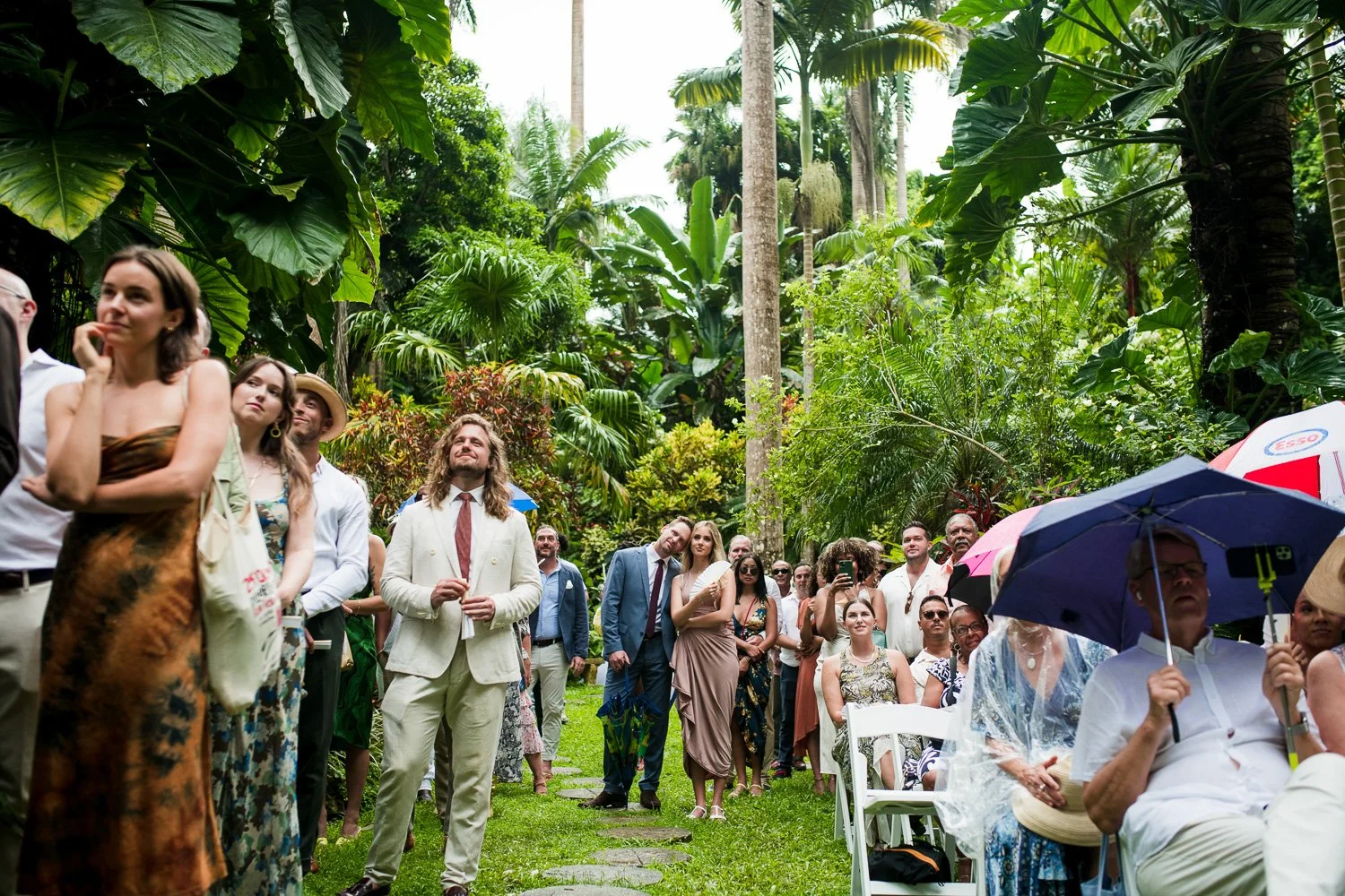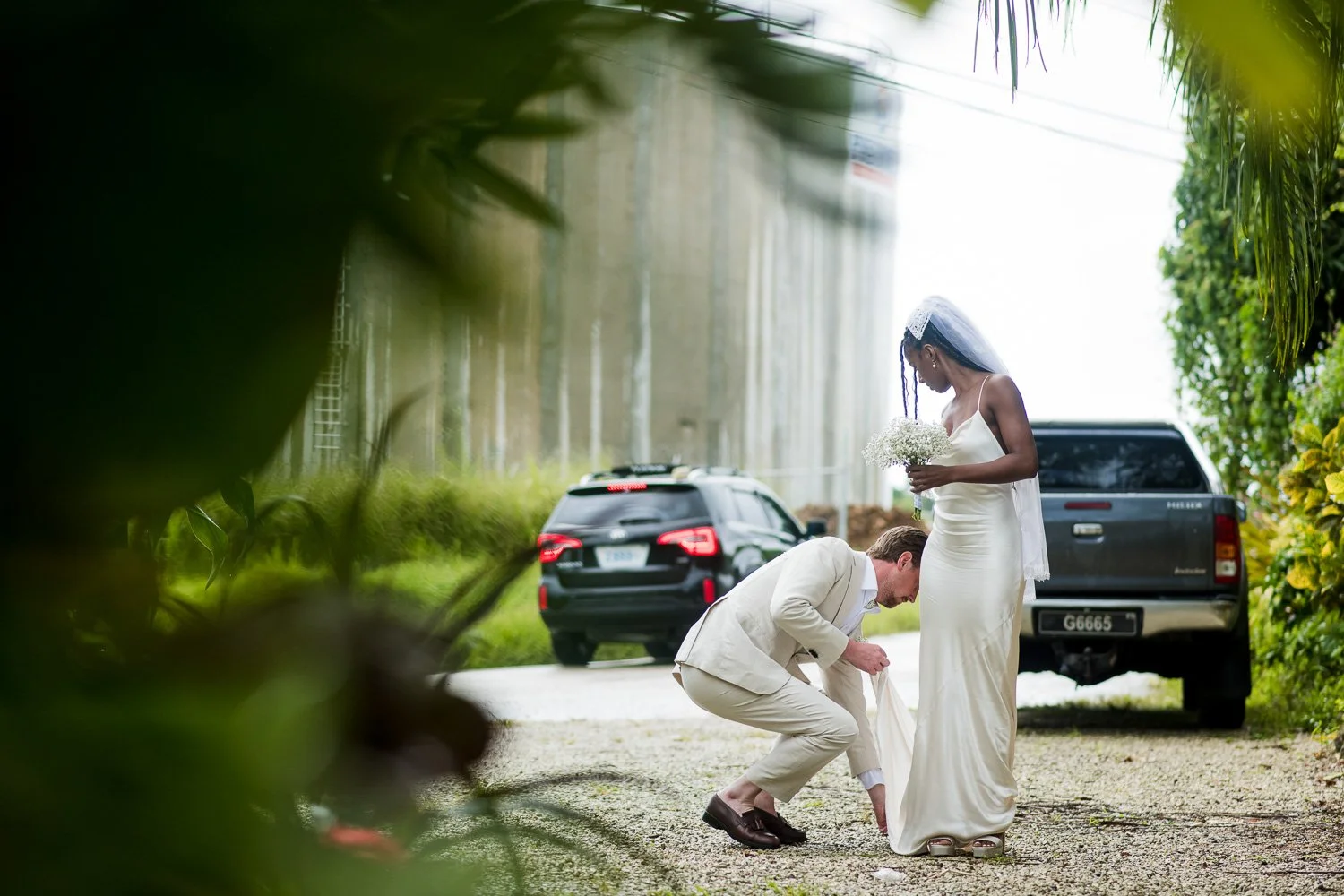 But never once was there a look of dismay on Jennifer or Joel’s face. From the time they arrived at the stunning Hunte’s Garden’s for their wedding, they had huge smiles on their faces. But more, they just laughed through it all. Her white dress turned brown on the bottom, the aisle was water logged, they drank champagne under an umbrella.