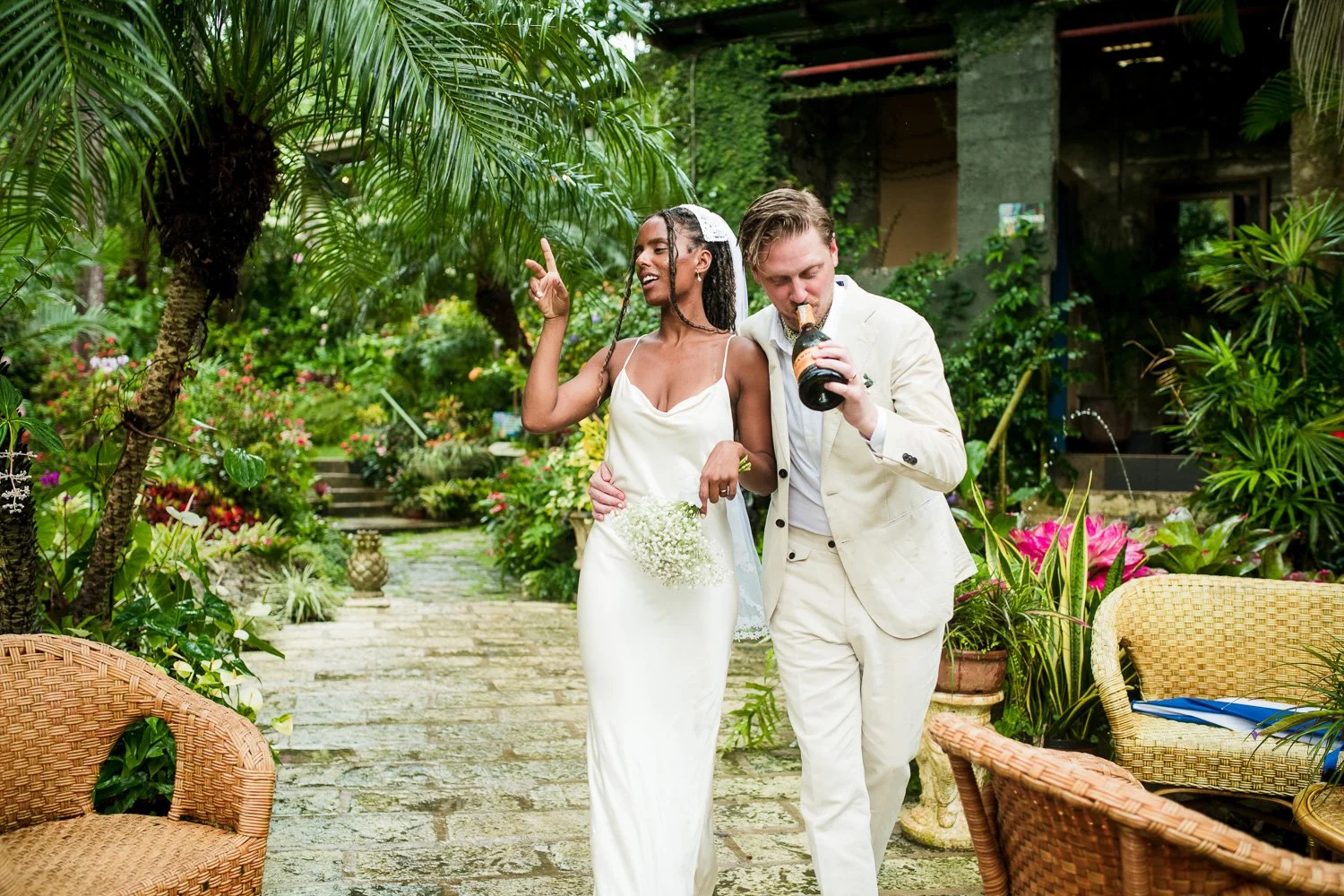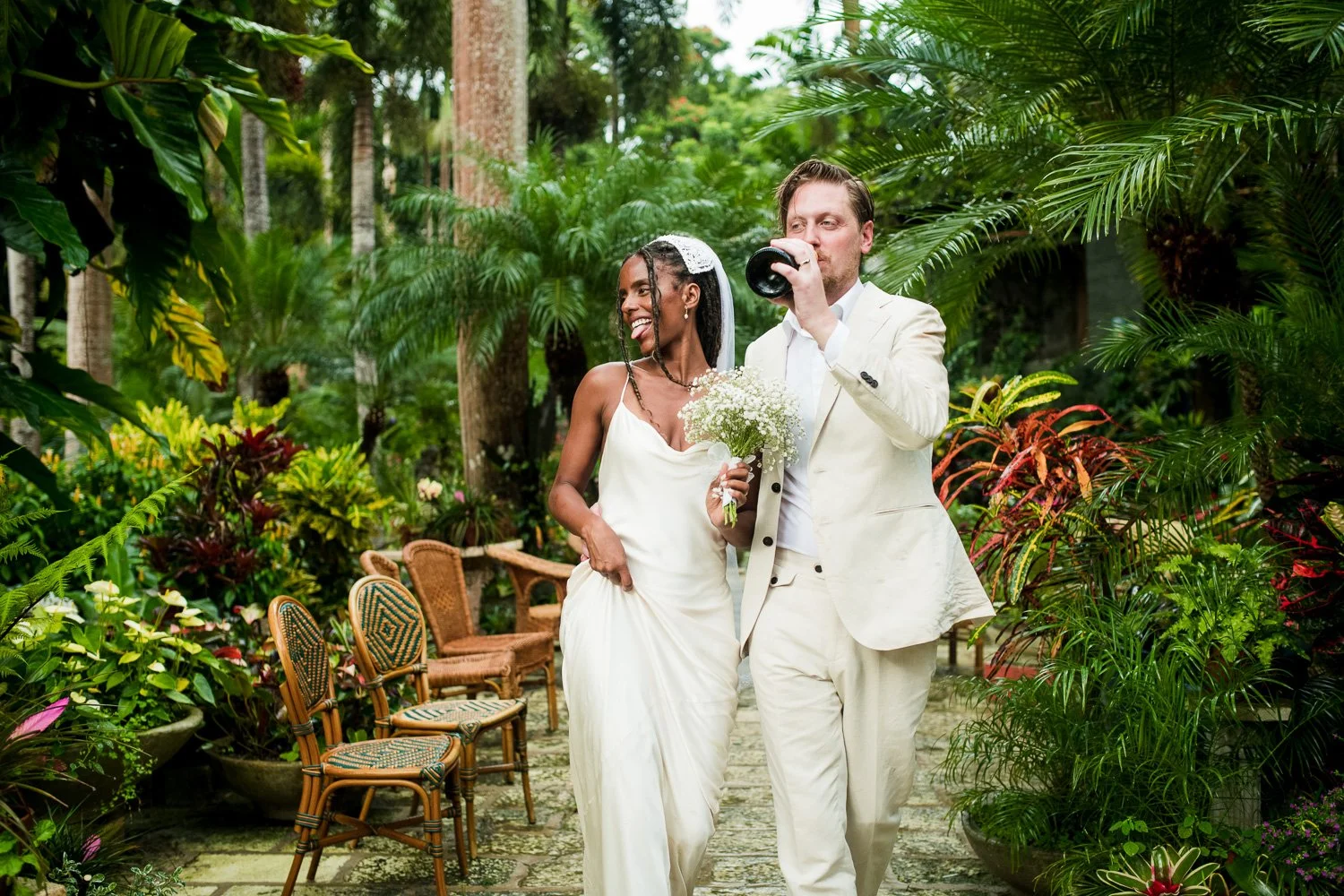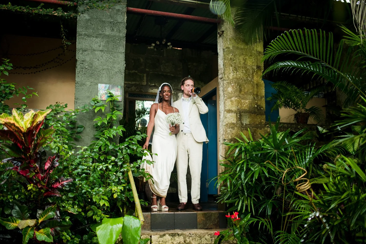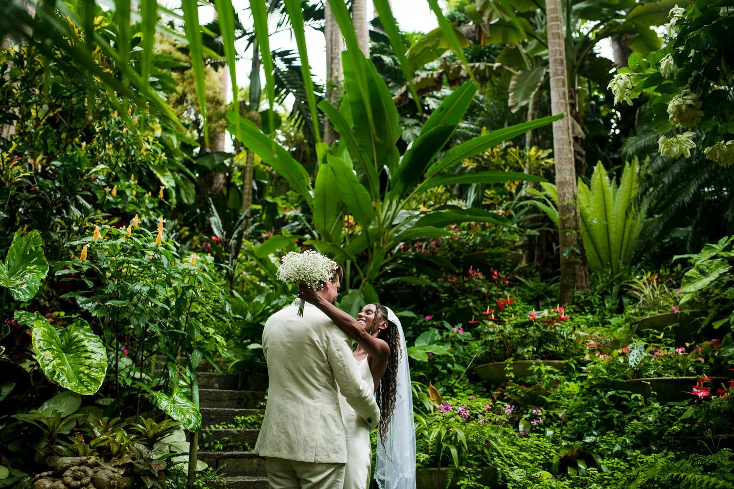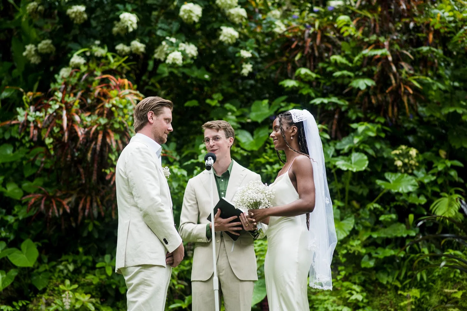 But never once was there a look of dismay on Jennifer or Joel’s face. From the time they arrived at the stunning Hunte’s Garden’s for their wedding, they had huge smiles on their faces. But more, they just laughed through it all. Her white dress turned brown on the bottom, the aisle was water logged, they drank champagne under an umbrella.